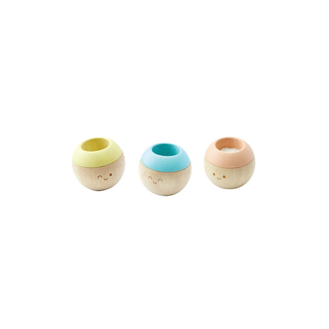3 mingi senzoriale din lemn pentru stimularea simțurilor vizual, tactil și auditiv, Plan Toys